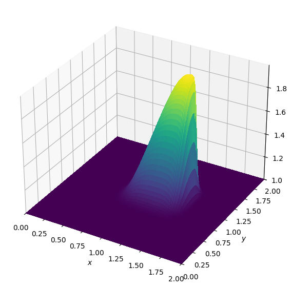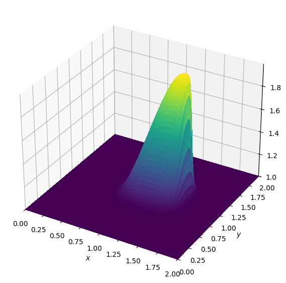 \[\begin{aligned} u_{i,j}^{n+1} &= u_{i,j}^n - u_{i,j}^n \frac{\Delta t}{\Delta x} (u_{i,j}^n-u_{i-1,j}^n) - v_{i,j}^n \frac{\Delta t}{\Delta y} (u_{i,j}^n-u_{i,j-1}^n) \\ \\ v_{i,j}^{n+1} &= v_{i,j}^n - u_{i,j}^n \frac{\Delta t}{\Delta x} (v_{i,j}^n-v_{i-1,j}^n) - v_{i,j}^n \frac{\Delta t}{\Delta y} (v_{i,j}^n-v_{i,j-1}^n) \end{aligned}\]So, for starters we will re-create the original example run in pure NumPy array notation, before demonstrating the Devito version. Let’s start again with some utilities and parameters: